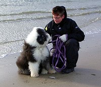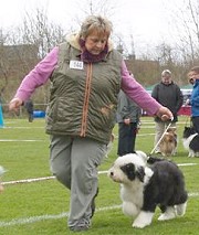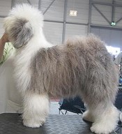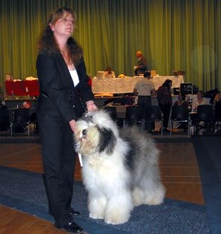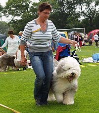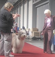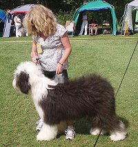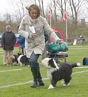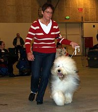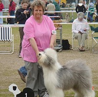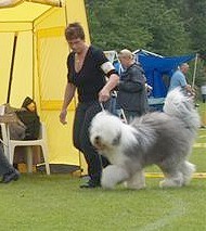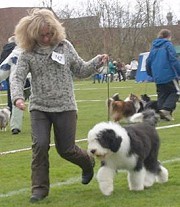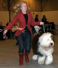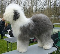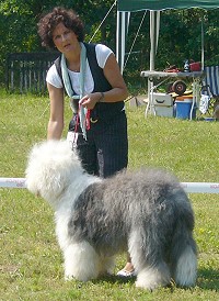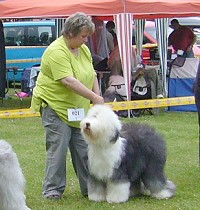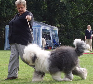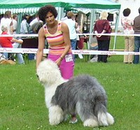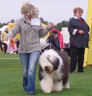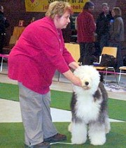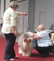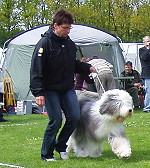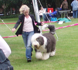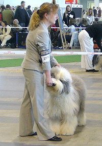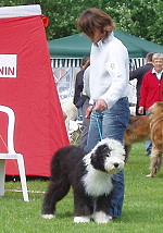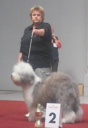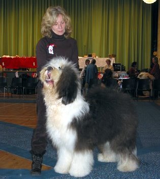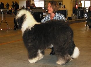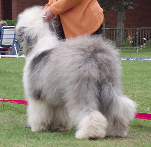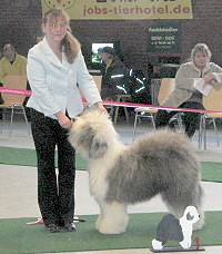 der Hinterhand wie die meisten Bobtails zu eng, Vorderhand heute nicht stabil und nicht parallel geführt. Sehr schönes Haar, sicheres Verhalten.”