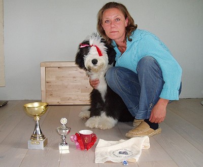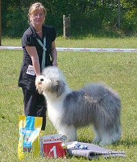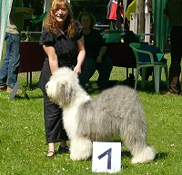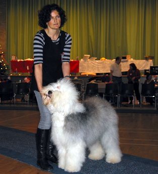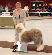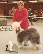 Richterbericht: “Sie zeigt ein typisches glückliches OES Temperament, guter Kopf, kräftiges Vorgesicht, dunkle Augen, gute Rückenlinie, quadratisch, könnte etwas mehr Hinterhandwinklung gebrauchen. Bewegt sich gut und es kommt gutes Fell durch.”