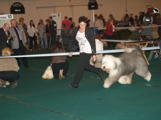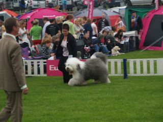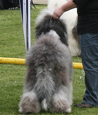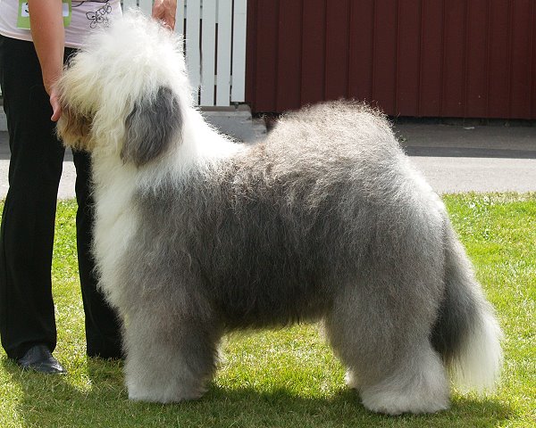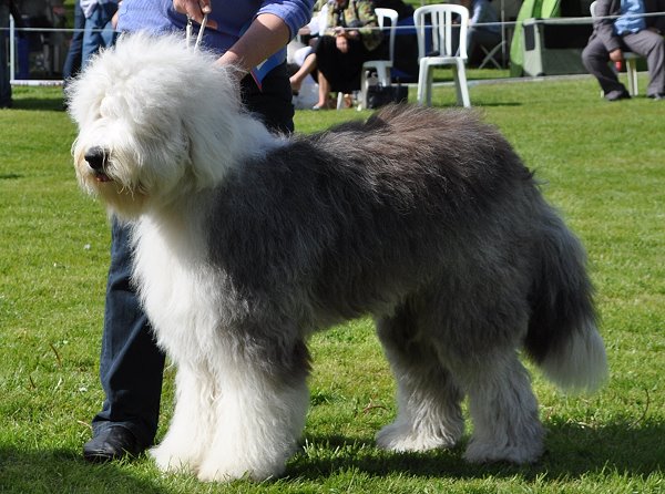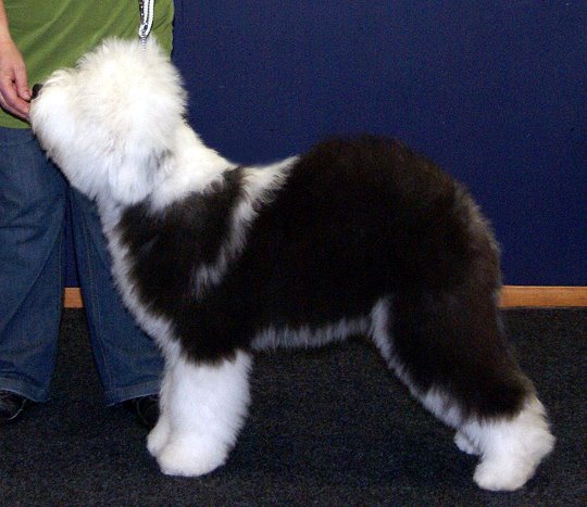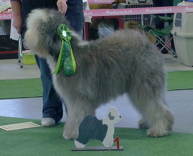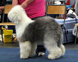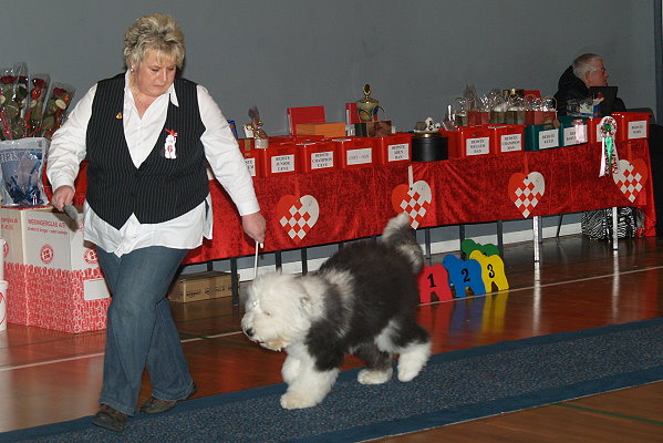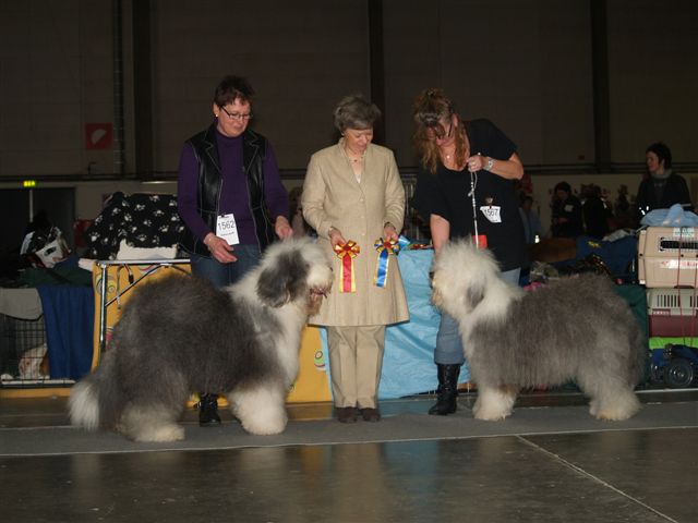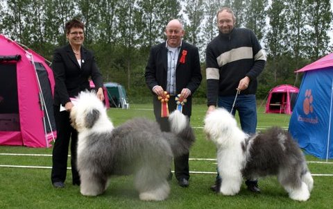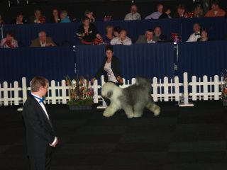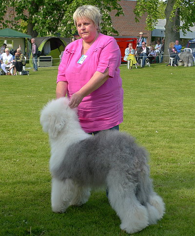 Goed opgevulde en voldoende gehoekte achterhand, fraai bone. Zeer typische gangen, prettig gedrag, prima presentatie. Fraaie overvloedige vacht van prima struktuur.”