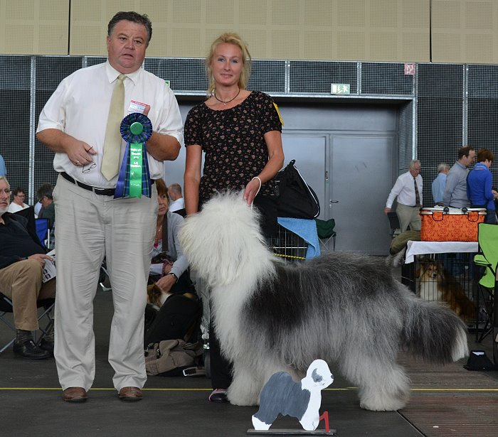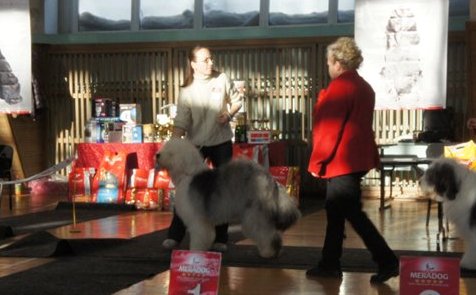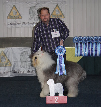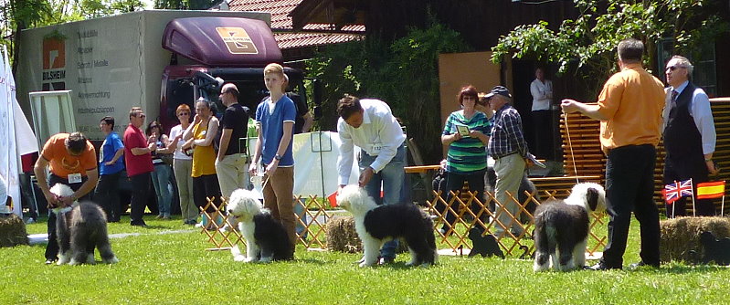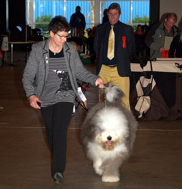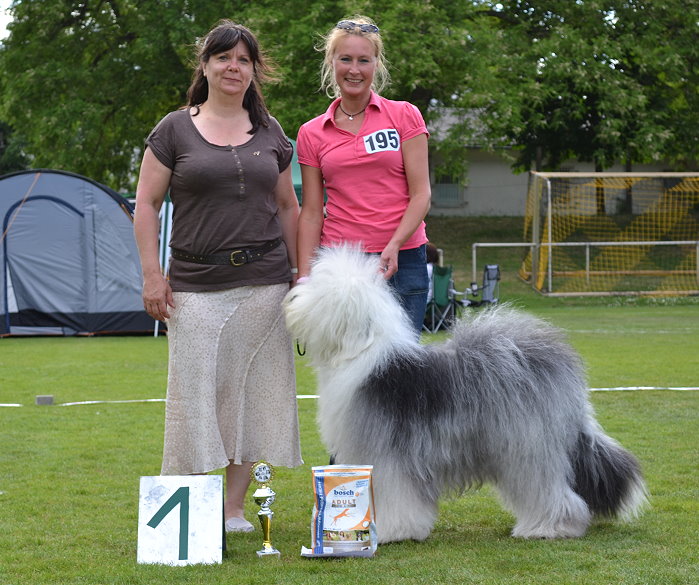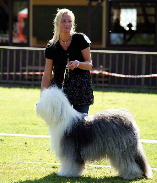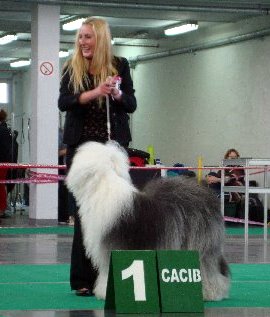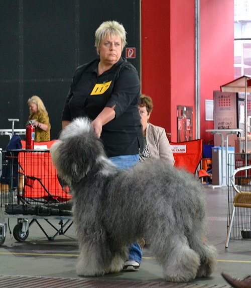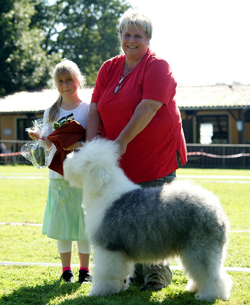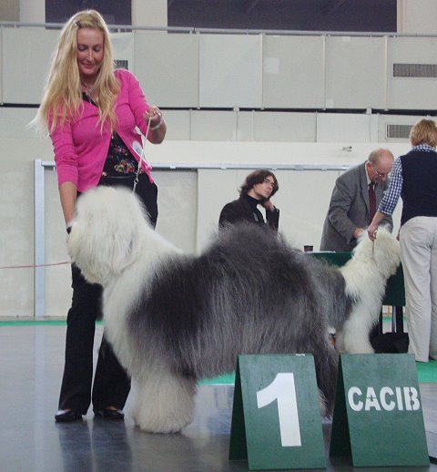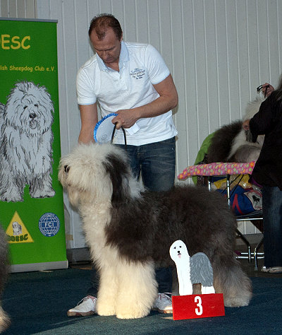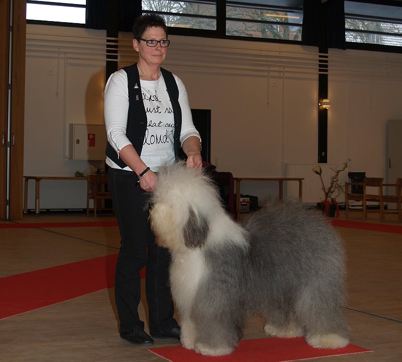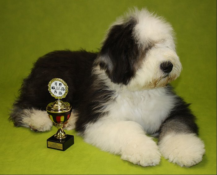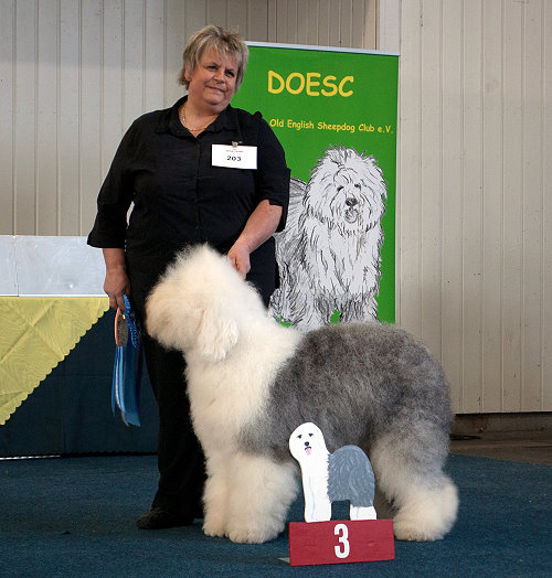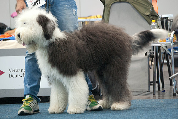 Richterbericht: “23 Monate alte Bobtailhündin von gepflegter Gesamterscheinung, gut proportionierter Kopf, hellbraune Augen,