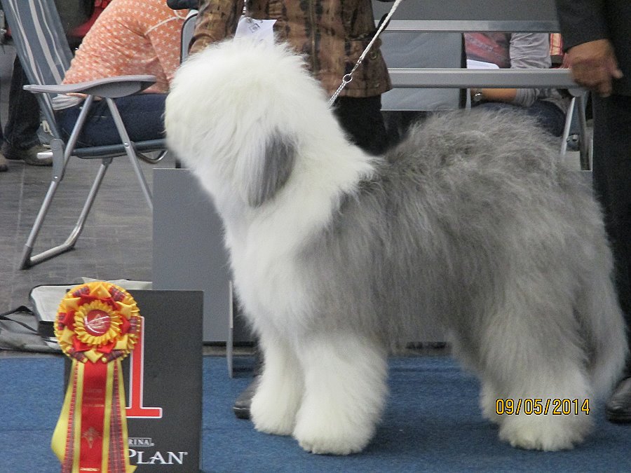 Richterbericht: “Freundlicher Rüde von gutem Typ, gute Proportionen, guter Kopf mit zu hellen Augen, Unterkiefer sollte kräftiger und breiter sein,