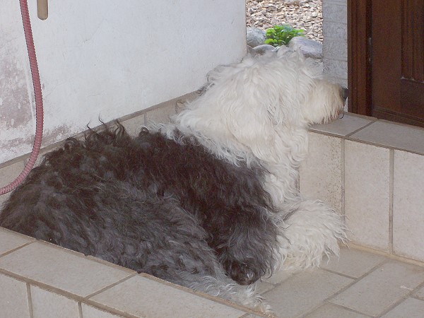 Der Lieblings-Schlafplatz! Mein erster Bobtail, der die Hundebadewanne scheinbar abgöttisch liebt...