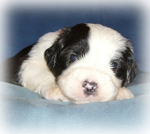 Welpe Nr. 6 - Rüde geboren um 13.38 Uhr Gewicht: 354 gr. Wiegt auf dem Bild 1.740 gr. Robin hat rechts ein blaues Auge!