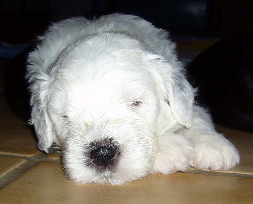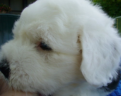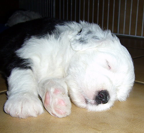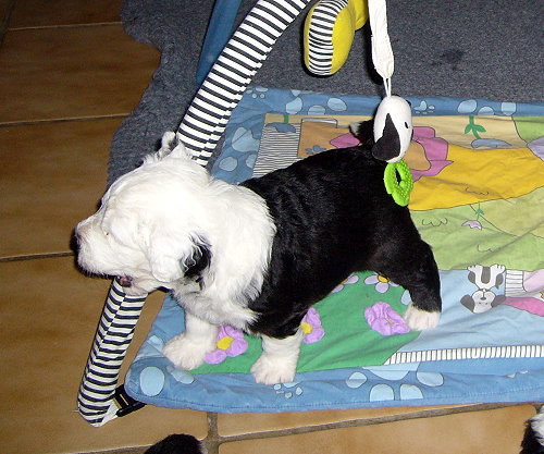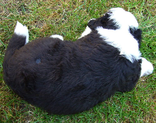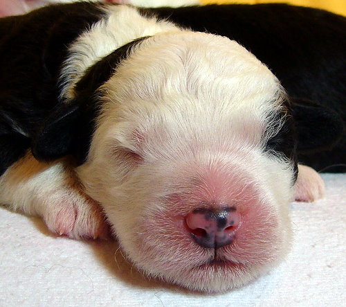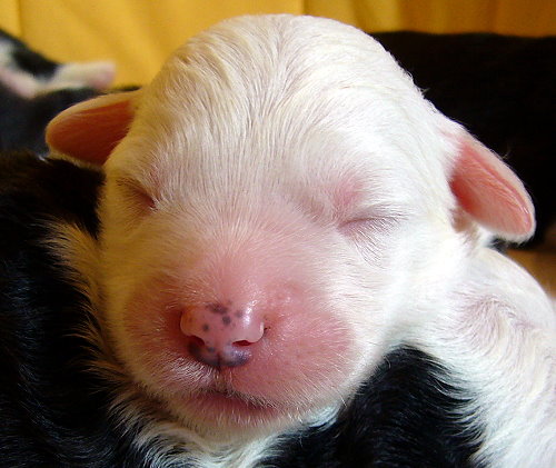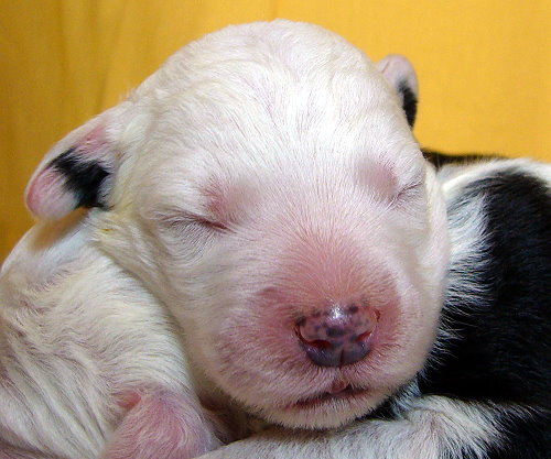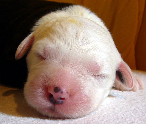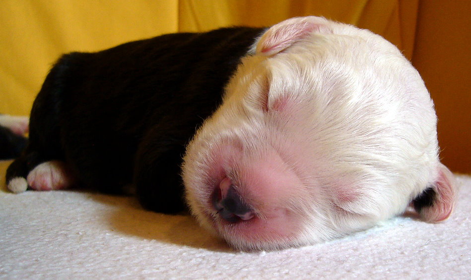 Nr. 9: 1.15 Uhr - Hündin 516 gr. - rechts und links schwarzes Ohr, Punkt auf dem Kopf Nr. 9 mußte aufgrund ungünstiger Steißlage nach über 3 Std. Wehen von meiner Tierärztin mit zarter Hand geholt