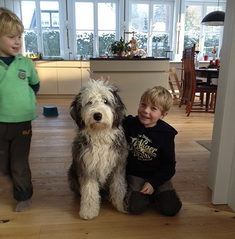 wenn er sich hier gezankt hat. Somit weicht sie ihm fast nie von der Seite. Wenn er Hausaufgaben macht, liegt sie z.B. immer vor seinen Füßen. Zwar werden die anderen beiden Jungs auch morgens