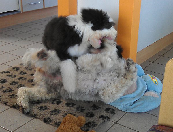 konsequent durchgezogen werden muß). Tja, mein Sohnemann benötigt noch einige Unterstützung was das Zusammenspiel betrifft, da er noch etwas ängstlich ist. Und unsere Hündin wehrt sich inzwischen auch,