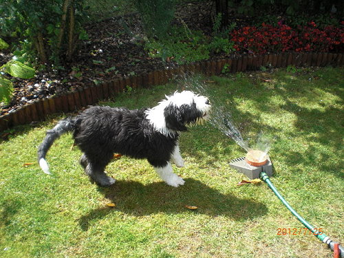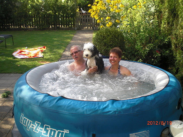 Im Garten steht bei uns ein kleiner Whirlpool, im Spiel und Übermut ist sie dann mal so reingehüpft, dann stand sie staunend im Wasser, ups...