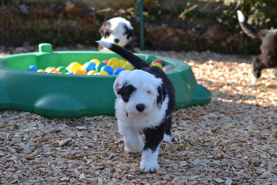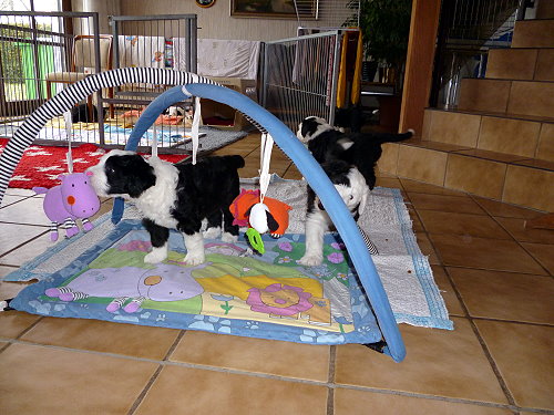 Mit 4-5 Wochen zieht die Bande dann in den Hundebereich um. Fast 20 qm Hunderaum und ein mehr als 100 qm Welpenauslauf
