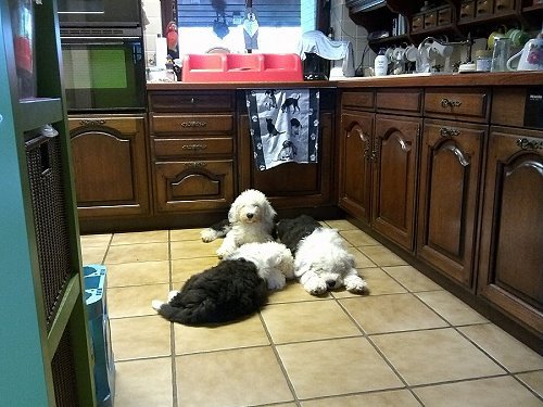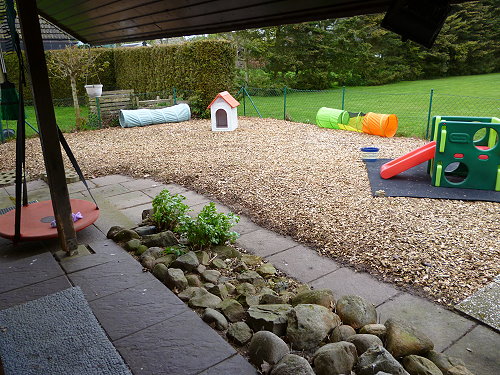 gewünscht habe. Mein Mann hat damals mitgespielt und so ist der untere rechte Trakt des Hauses nur für die Hunde eingerichtet worden, was keinesfalls bedeutet, daß die Hunde auch nur da leben müssen! Aber es gibt einen Hunderaum mit Hintereingang zur gemauerten Hundebadewanne, gerade für Bobtails eine ideale Dreckschleuse. Dieser Raum dient auch ca. ab der 5.Lebenswoche den Welpen mit angrenzendem großen Auslauf als ideale Herberge.