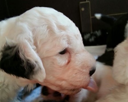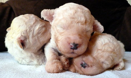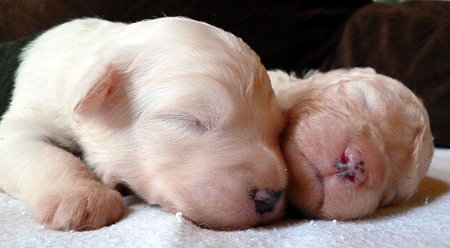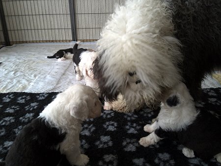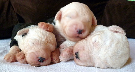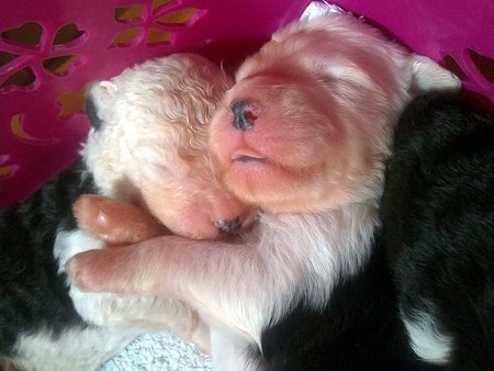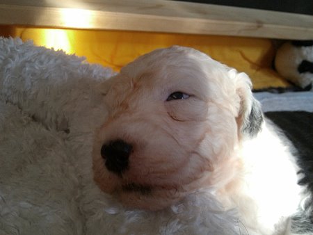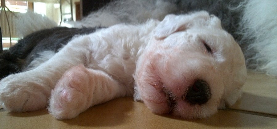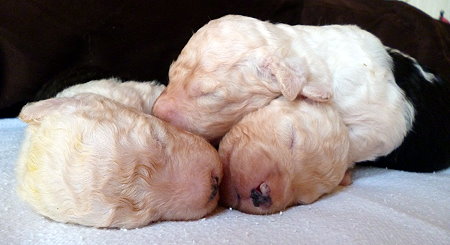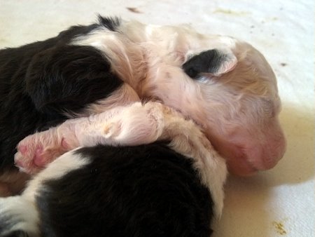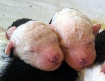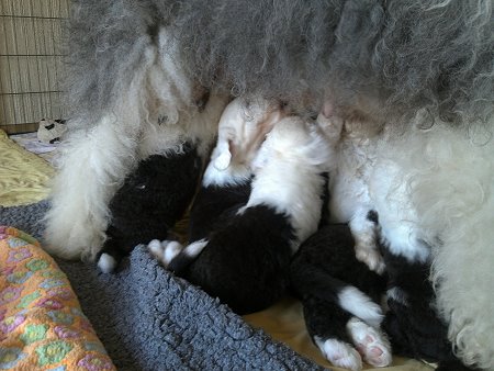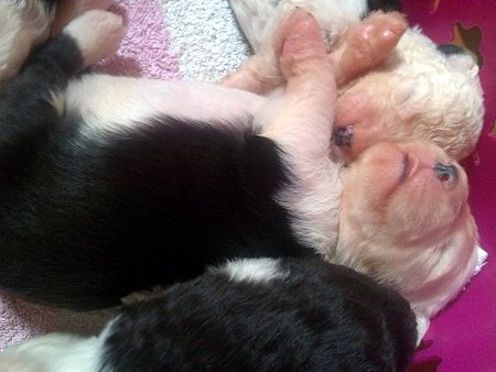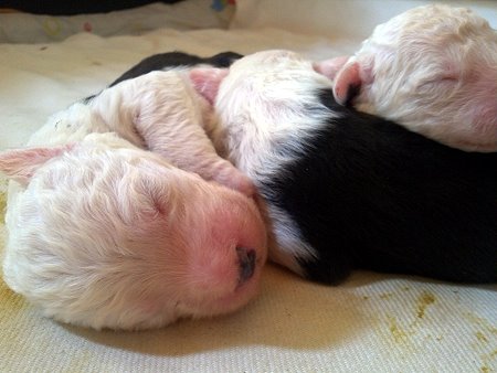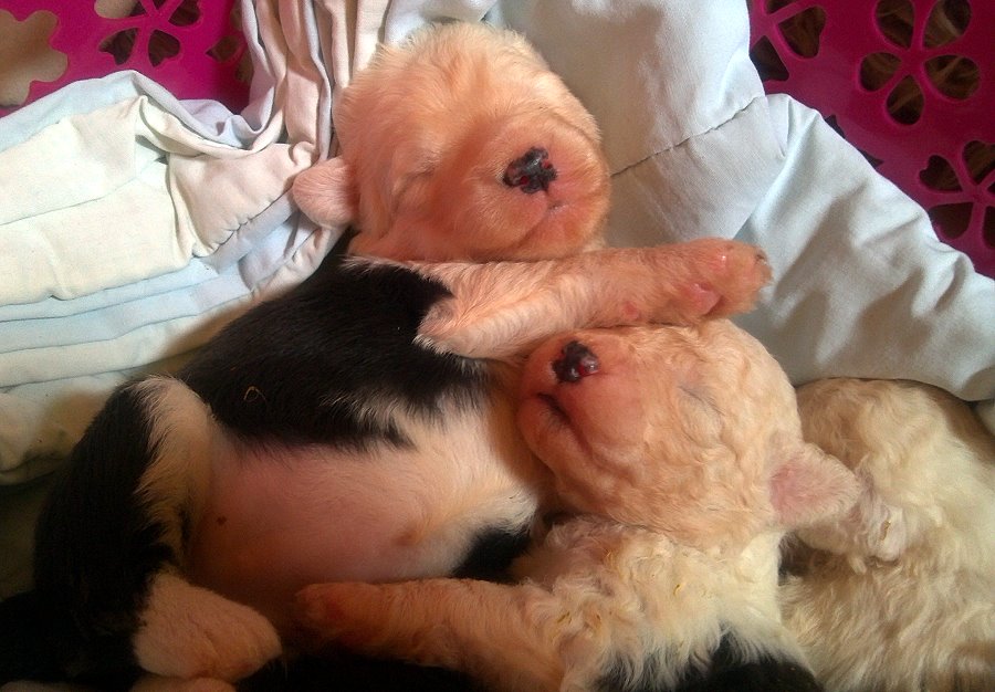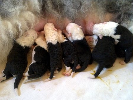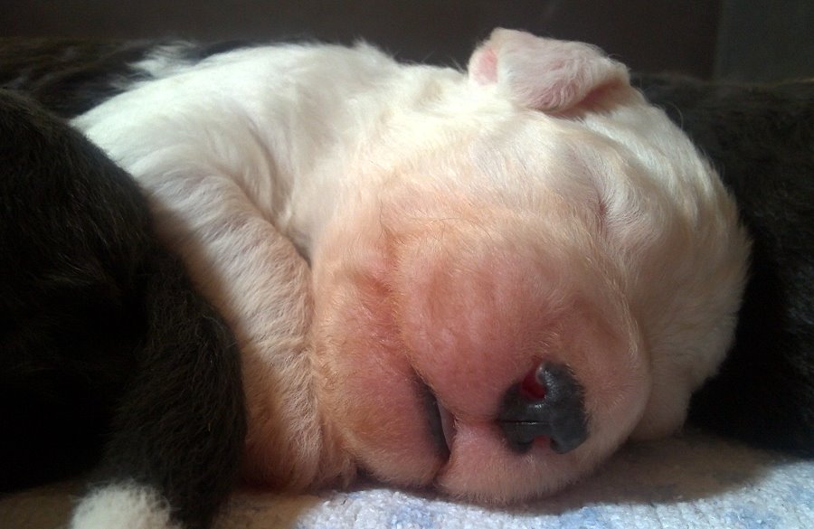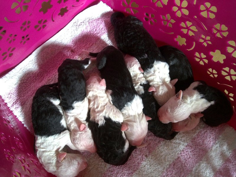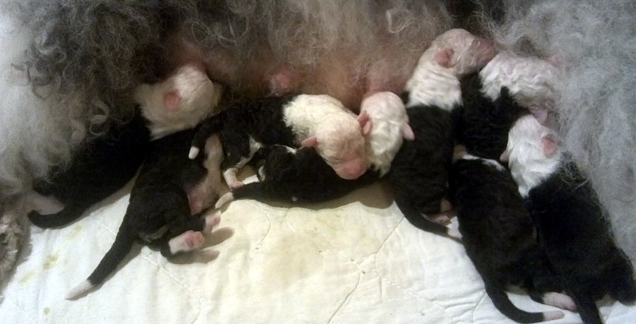 Keiner ist lebensschwach, alle haben geschlossene dunkle Decken und bereits Pigment an Nasen & Lefzen... Ich glaube, es ist mein 1. Wurf ohne Afterkrallen!