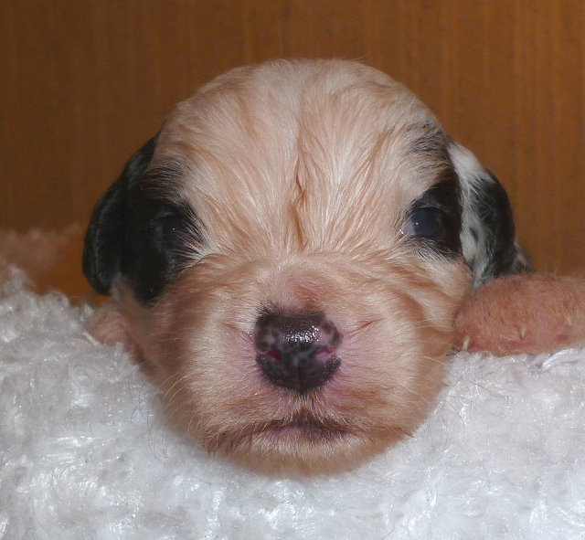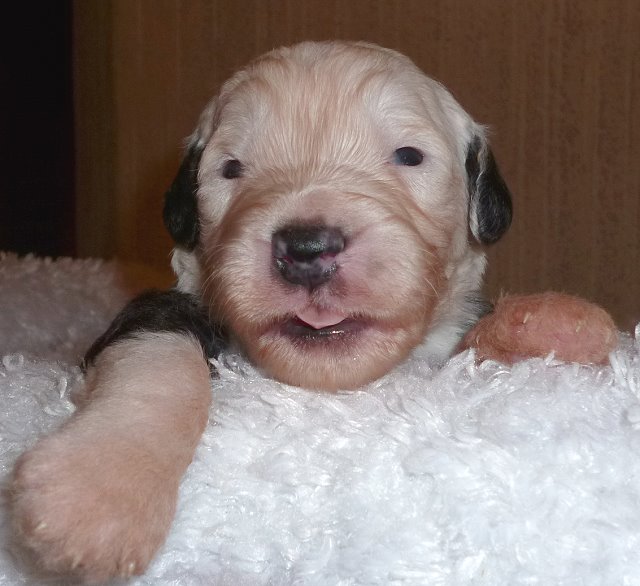 Sie “pflegt” ihre Welpen äußerst intensiv, daher sind bei den Welpen die Haare vom vielen Putzen leicht verfärbt.
