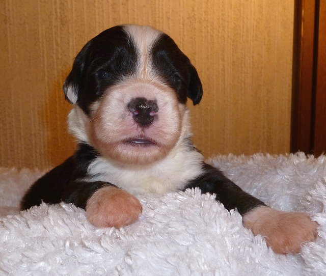 Mittlerweile sind die Augen offen und die Welpen fangen an, langsam auf optische und auch akustische Reize zu reagieren.
