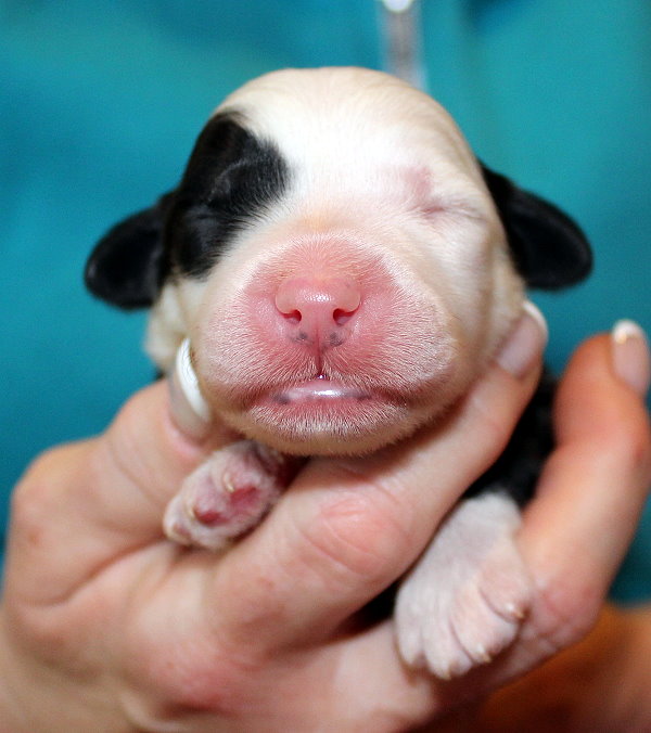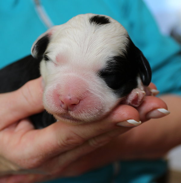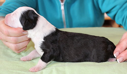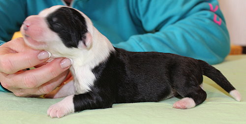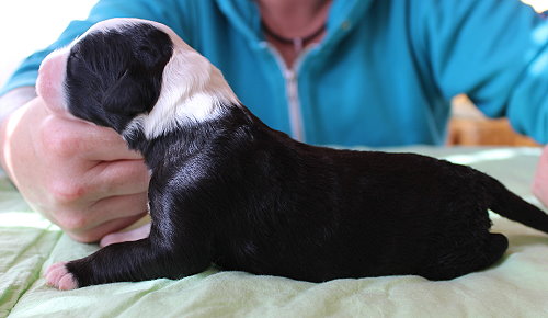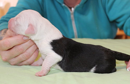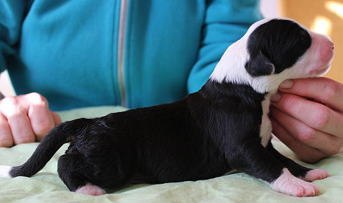 Sie hat 7 Welpen in 4 Stunden geboren, alle mit Hülle und Nachgeburt im Liegen, brauchte keine Hilfe beim Abnabeln.