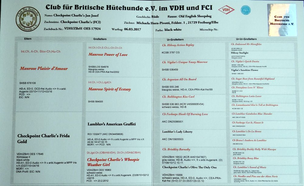 HD A & ED 0/0 - OCD-frei - vollzahniges Scherengebiß Audiometrie/BAER-tested +/+ PCD +/+ EIC-Ergebnis: Genotyp N/N